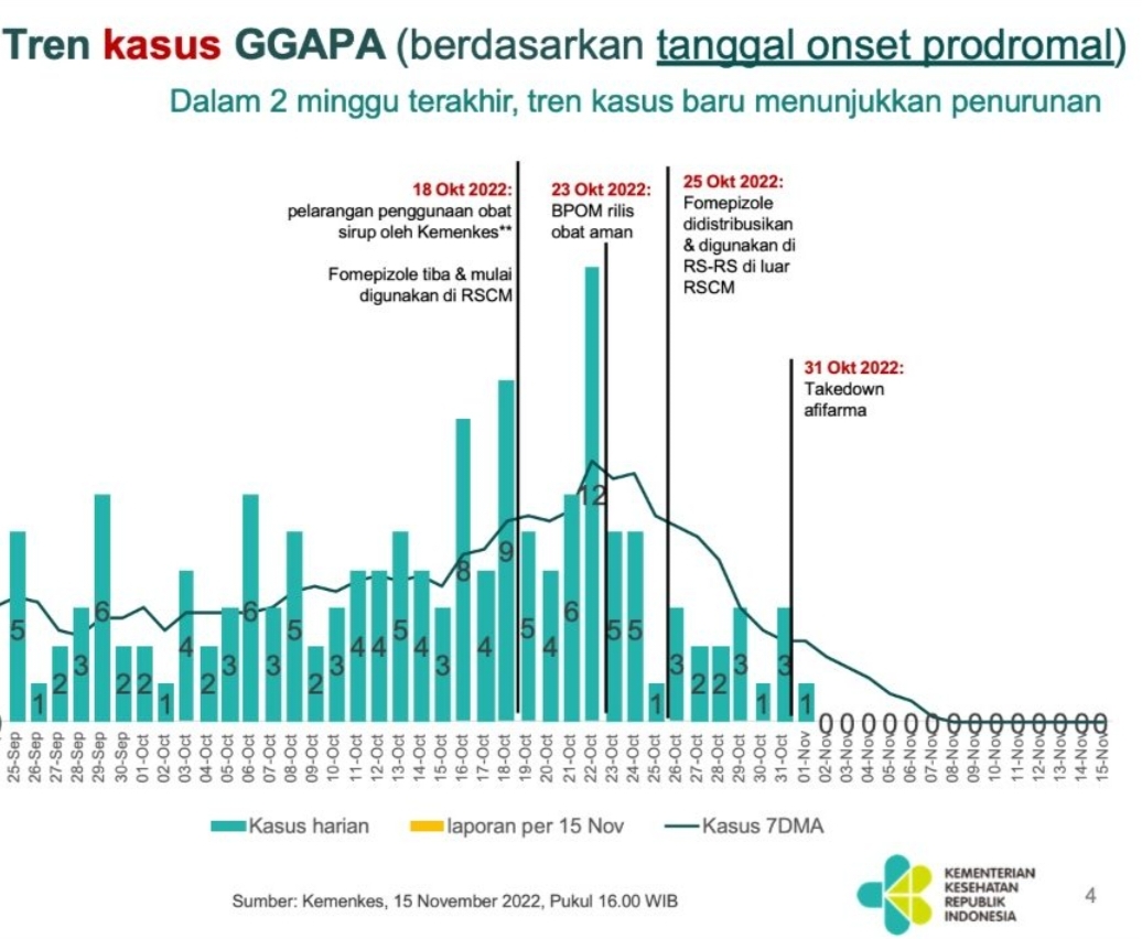 Menurut Syahril, menurunnya kasus kematian pada GGAPA disebabkan oleh penerbitan Surat Edaran Kemenkes pada 18 Oktober 2022 lalu yang melarang pengunaan obat sirup pada anak, hingga take down PT Afi Farma pada 31 Oktober 2022 dan penggunaan dari antidotum atau penawar fomepizole injeksi sebagai pengobatan yang efektif bagi pasien. “Memerlukan waktu untuk proses perawatan, kami harapkan seluruh pasien segera membaik,” kata Syahril.