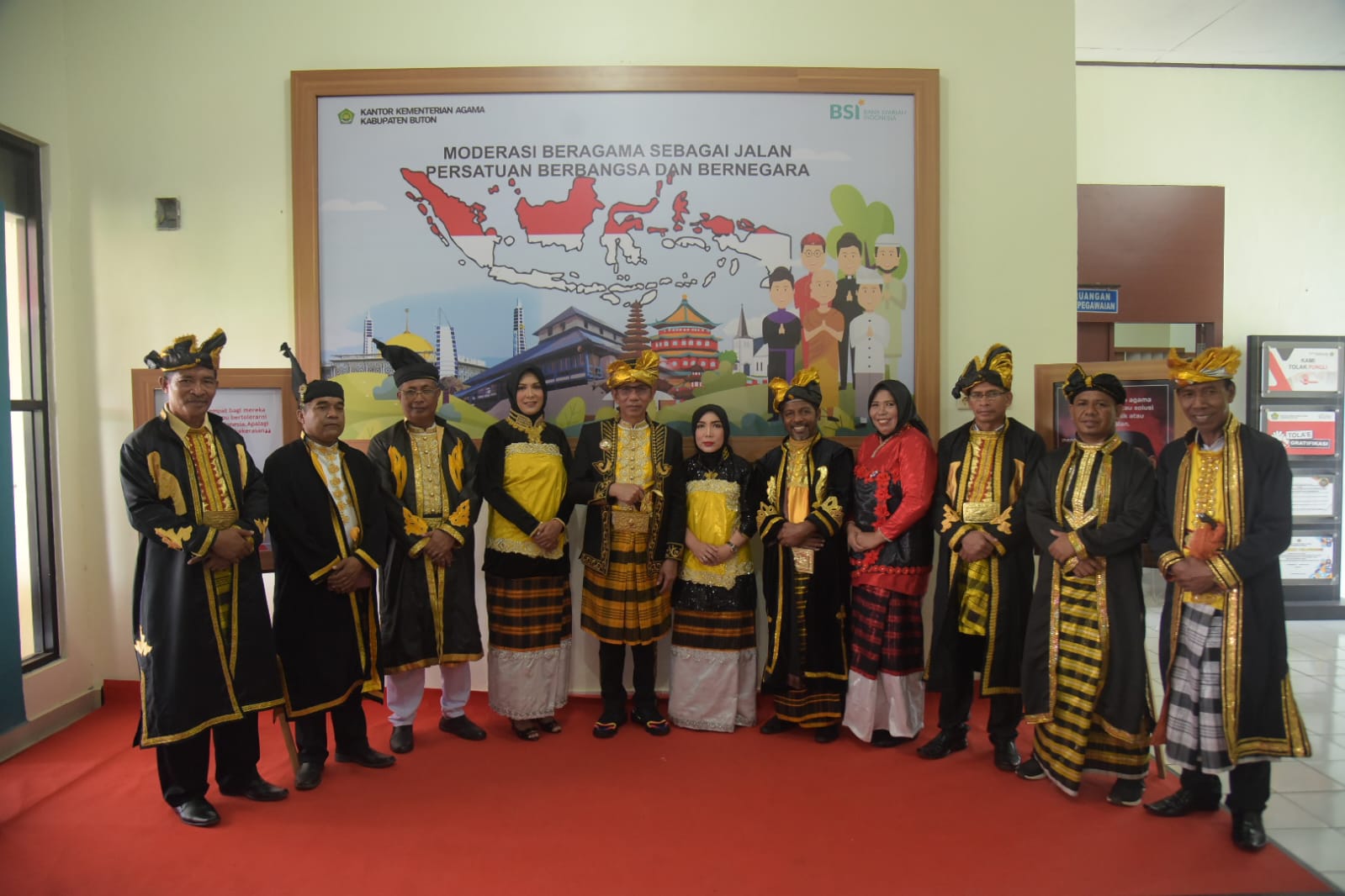Turut hadir pada upacara tersebut diantaranya para Forkopimda, Pejabat eselon II lingkup Pemkab Buton, dan seluruh Aparatur Sipil Negara (ASN) di lingkup Kemenag Buton. Menariknya, mereka hadir dengan menggunakan pakaian adat.