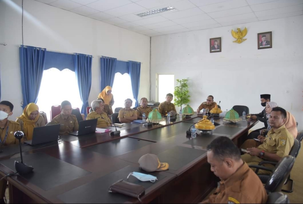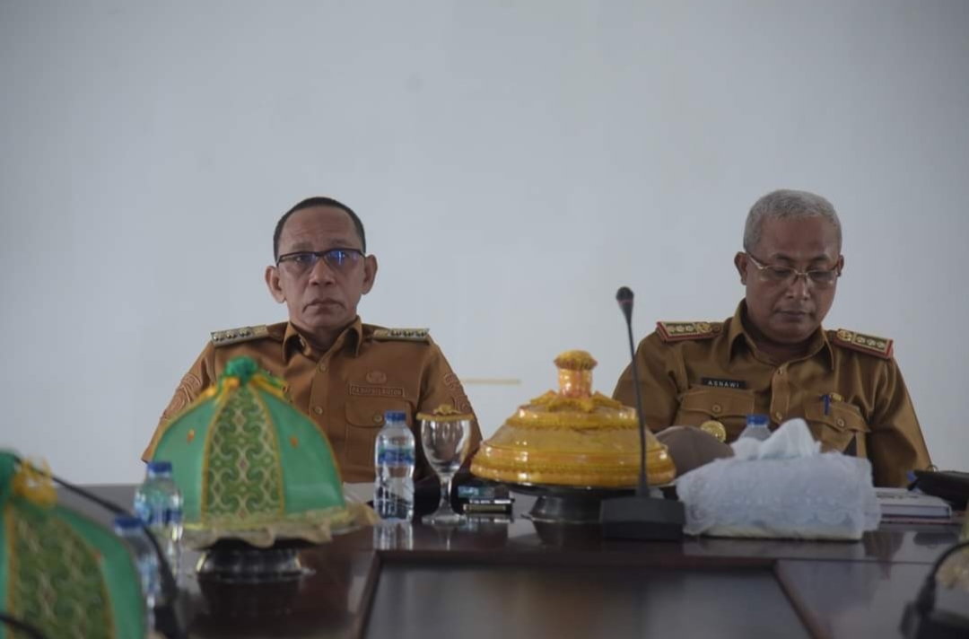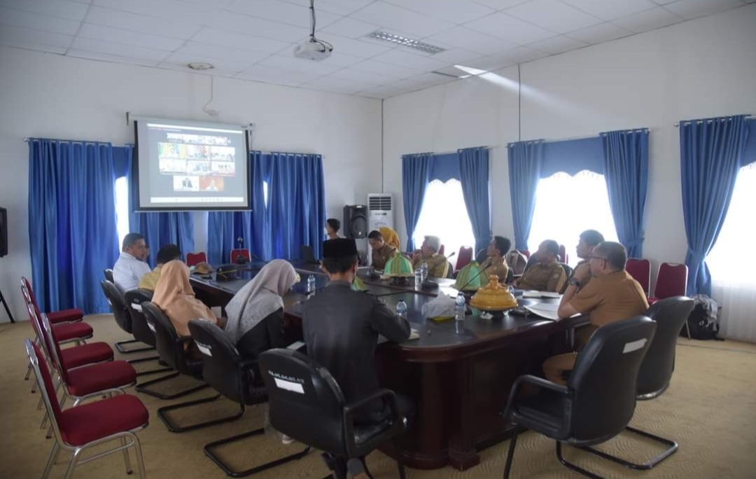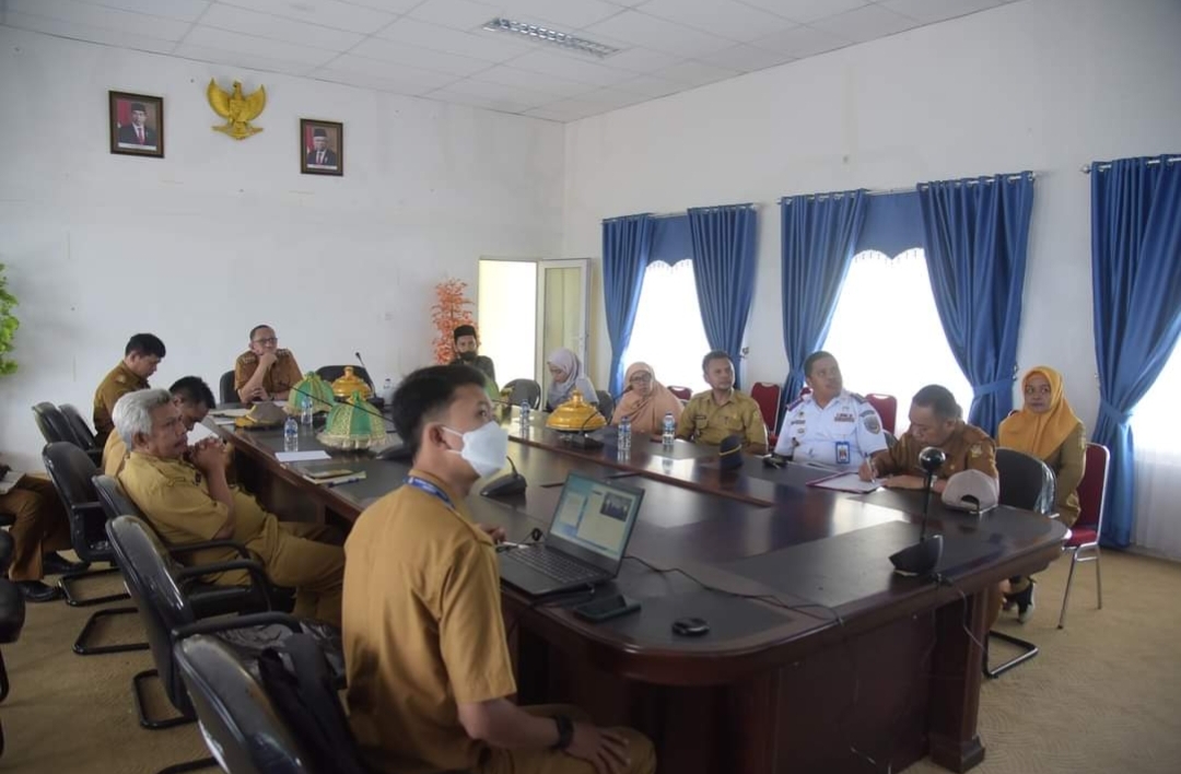 Pasarwajo – Penjabat (Pj) Bupati Buton, Basiran didampingi Sekretaris Daerah (Sekda) Buton, Asnawi Jamaluddin dan Tim Pengendalian Inflansi Daerah (TPID) Buton, mendengarkan pengarahan Menteri Dalam Negeri (Mendagri) pada Rapat Koordinasi (Rakor) pengendalian inflasi daerah yang dilaksanakan oleh Kementerian Dalam Negeri (Kemendagri) RI bersama Badan Pusat Statistik dan Badan Pangan Nasional secara virtual melalui zoom meeting di Anjungan VIP Kantor Bupati, Takawa, Senin (30/1/2023).