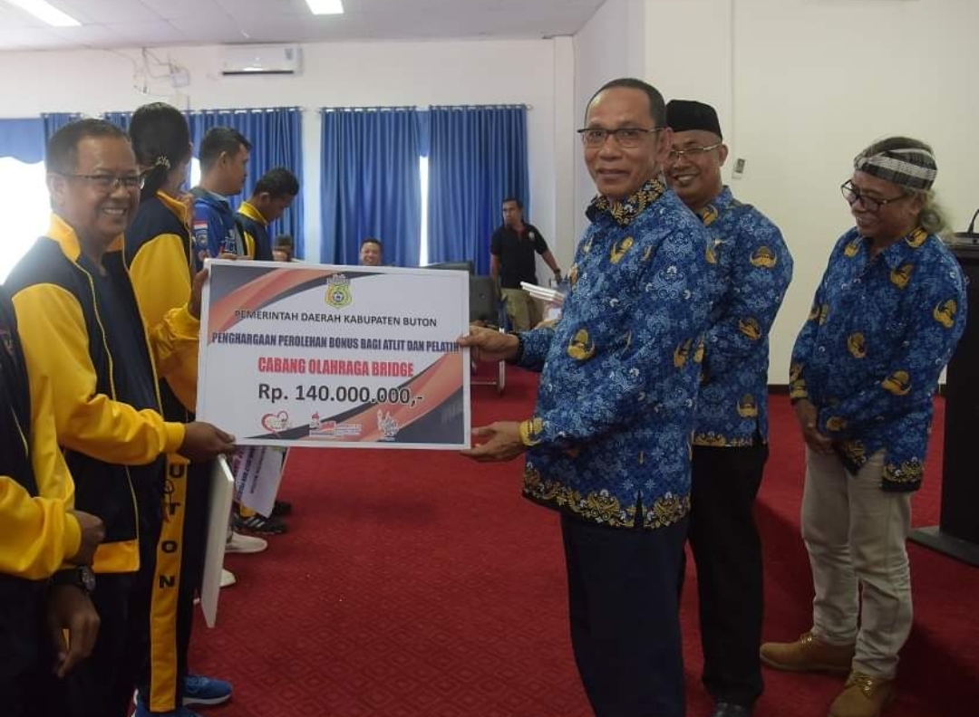 Pasarwajo – Penjabat (Pj) Bupati Buton, Drs Basiran MSi menyerahkan bonus Atlet dan pelatih tahap II bagi peraih medali pada pelaksanaan Pekan Olahraga Provinsi (Porprov) Sulawesi Tenggara (Sultra) ke XIV tahun 2022, di Aula Kantor Bupati Buton, Takawa, Jumat (17/2/2023).
