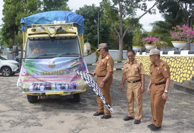 Mewakili Pj Bupati Buton, asisten Bidang Pemerintahan dan Kesra, Alimani, melepas angkutan Cadangan Pangan Pemerintah Daerah (CPPD) komoditi beras di rumah jabatan Bupati Buton, Pasarwajo, Senin (20/2/2023).