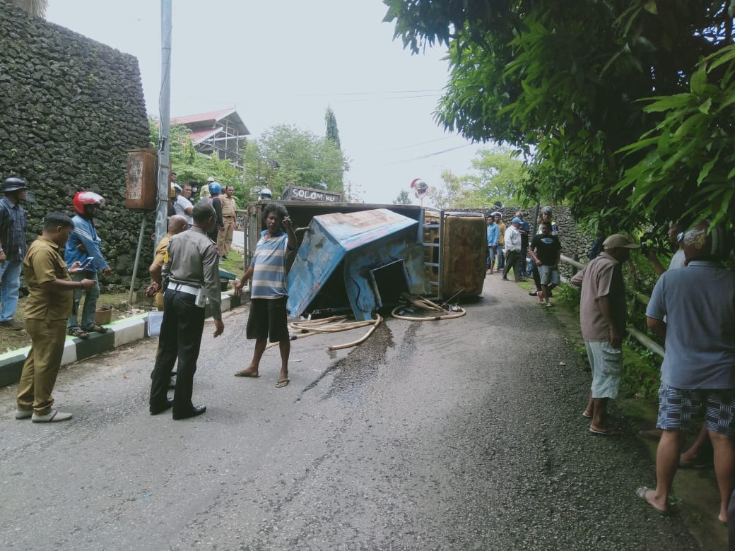 Baubau – Sebuah mobil truk tangki air terbalik di tanjakan pintu masuk benteng Keraton Buton, Kota Baubau, Provinsi Sulawesi Tenggara (Sultra).