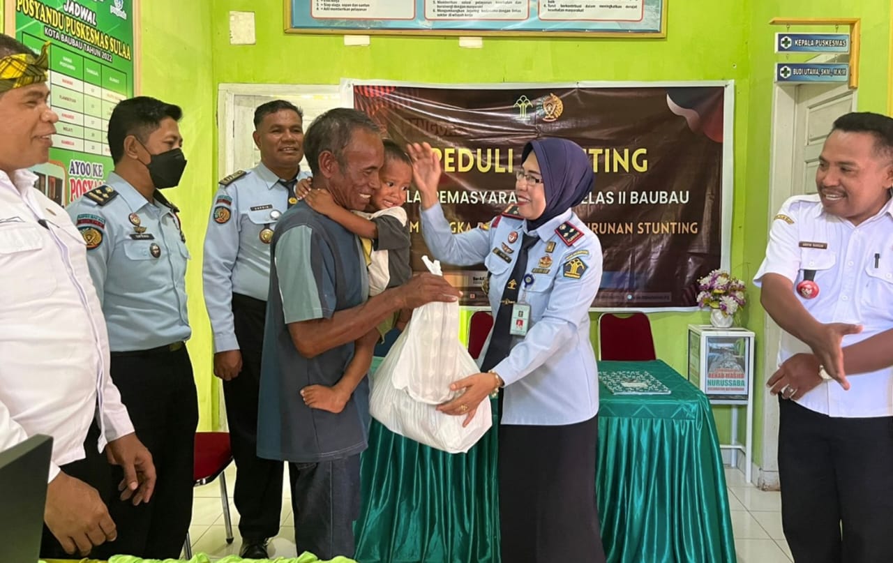 Baubau – Balai Pemasyarakatan (Bapas) Kelas II Baubau turut ikut serta dalam upaya pencegahan dan penurunan kasus stunting dengan membagikan Paket Makanan Sehat (PMS) kepada balita yang terindikasi memiliki potensi Stunting di Kelurahan Sulaa, Kecamatan Betoambari, Kota Baubau, Rabu (12/4/2023).